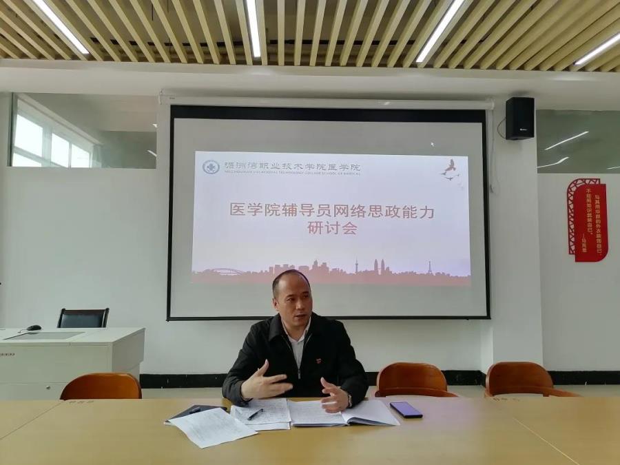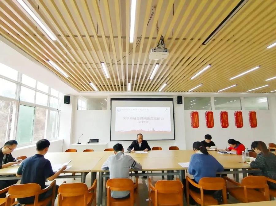 会议首先对网络思政教育的意义和当前医学院网络思政教育现状进行分析。会议指出,网络思想政治教育作为辅导员的九项主要工作职责之一,是辅导员应具备的本领之一。面对网络信息时代新形势的发展,辅导员思想政治教育工作也面临新的挑战。新时代辅导员要加强运用新媒体新技术,推动思想政治工作传统优势与信息技术高度融合。运用网络新媒体对学生开展思想引领、学习指导、生活辅导、心理咨询等工作。