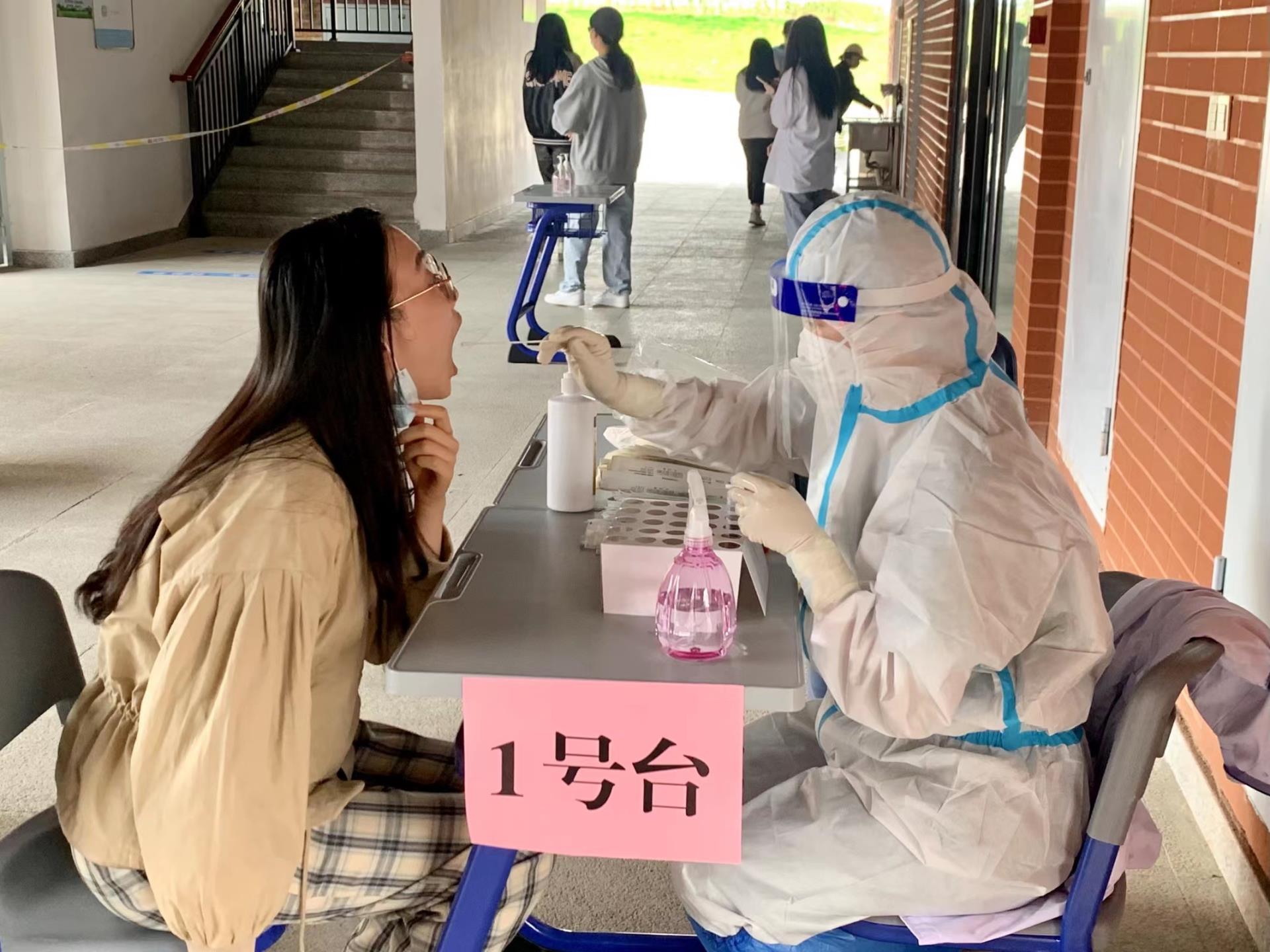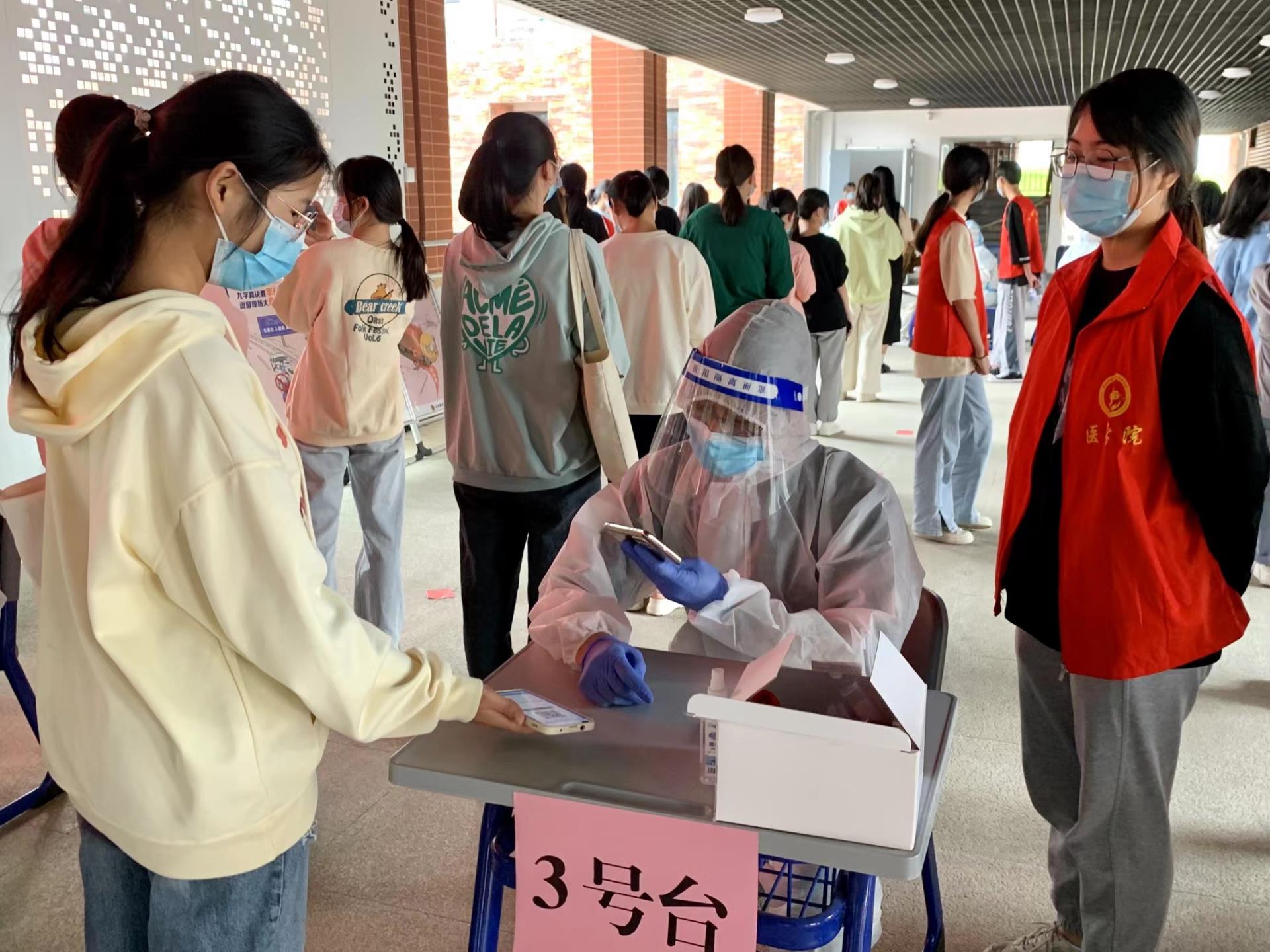 在师生党员、志愿者的积极引导下,全体教职工以及同学们提前扫码登记并做好个人防护,保持距离有序排队,确保信息采集、核酸采样等各项工作有效开展。
