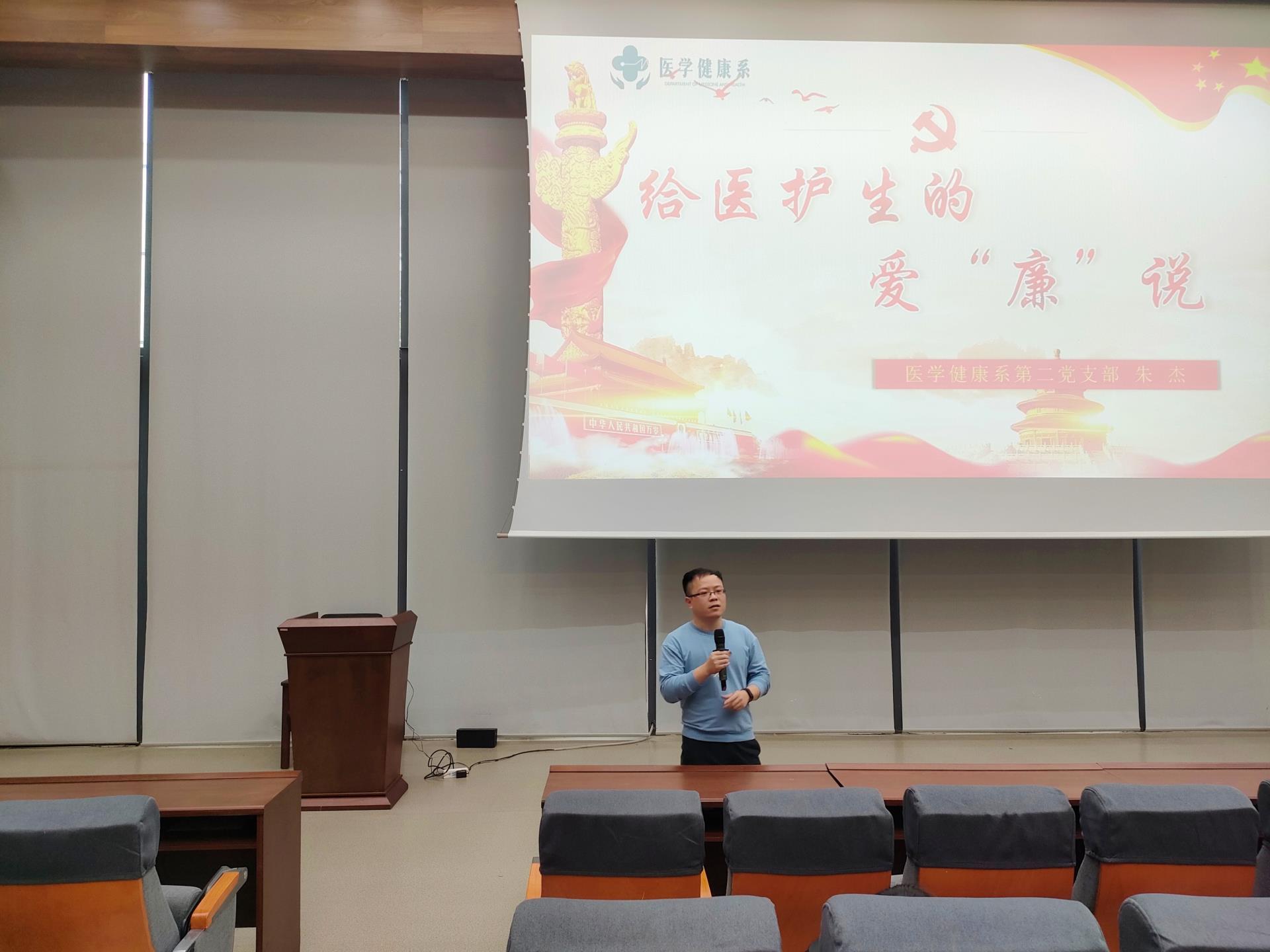 为深化新时代廉洁文化建设,提高医护生对廉洁行医的意识,引导同学们扣好廉洁从医的“第一粒扣子”,5月12日,医学健康系第二党支部书记朱杰在信息楼330人报告厅开展以《给医护生的爱“廉”说》为主题,为即将踏上临床实习岗位的医护生上了一堂生动形象的廉洁教育专题党课。